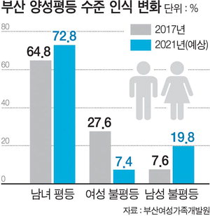 19ÀÏ ºÎ»ê¿©¼º°¡Á·°³¹ß¿øÀÌ ¹ßÇ¥ÇÑ 'ºÎ»ê½Ã¹ÎÀÇ ¾ç¼ºÆòµî Àνİú Á¤Ã¥¼ö¿ëµµ Á¶»ç'¿¡ µû¸£¸é ÇöÀç ºÎ»êÀÇ ¾ç¼ºÆòµî ¼öÁØÀ» ¹¯´Â Áú¹®¿¡ ÀÀ´äÀÚÀÇ 64.8%(³² 72.5%¡¤¿© 57.5%)°¡ 'ÆòµîÇÏ´Ù'°í ´äÇß´Ù. ¿©¼ºÀÌ ´õ ºÒÆòµîÇÏ´Ù´Â 27.6%(³² 15.4%¡¤¿© 39.2%)¿´´Ù. ¹Ý´ë·Î 7.6%(³² 12.1%¡¤¿© 3.3%)´Â ³²¼ºÀÌ ´õ ºÒÆòµîÇÏ´Ù°í »ý°¢ÇÏ´Â °ÍÀ¸·Î Á¶»çµÆ´Ù.