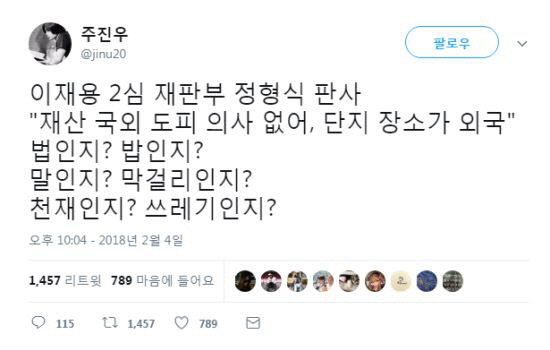 ÁÖÁø¿ì ±âÀÚ´Â Áö³ 5ÀÏ ÀÚ½ÅÀÇ Æ®À§ÅÍ¿¡ ¡°ÀÌÀç¿ë 2½É ÀçÆÇºÎ Á¤Çü½Ä ÆÇ»ç ¡®Àç»ê ±¹¿Ü µµÇÇ ÀÇ»ç ¾ø¾î, ´ÜÁö Àå¼Ò°¡ ¿Ü±¹¡¯¡±À̶ó´Â °¨Çü ÀÌÀ¯¸¦ ¾ð±ÞÇÏ¸ç ¡°¹ýÀÎÁö? ¹äÀÎÁö?¡±¶ó°í ÁöÀûÇß´Ù. ÀÌ¾î ±×´Â ¡°¸»ÀÎÁö? ¸·°É¸®ÀÎÁö?, õÀçÀÎÁö? ¾²·¹±âÀÎÁö?¡±¶ó°í µ¡ºÙ¿´´Ù.