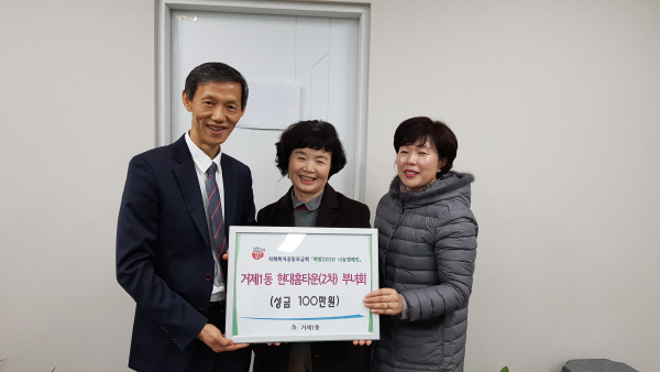 ¿¬Á¦±¸ °ÅÁ¦1µ¿(µ¿Àå ½Å¼º¹Î)Àº Çö´ëȨŸ¿î 2Â÷ ºÎ³àȸ(ȸÀå ±èÁ¤¼ø)·ÎºÎÅÍ Áö³ 12¿ù 31ÀÏ »çȸº¹Áö°øµ¿¸ð±Ýȸ Èñ¸Á 2020 ³ª´® Ä·ÆäÀÎ ÀÌ¿ôµ½±â ¼º±Ý 100¸¸ ¿øÀ» Àü´Þ¹Þ¾Ò´Ù.