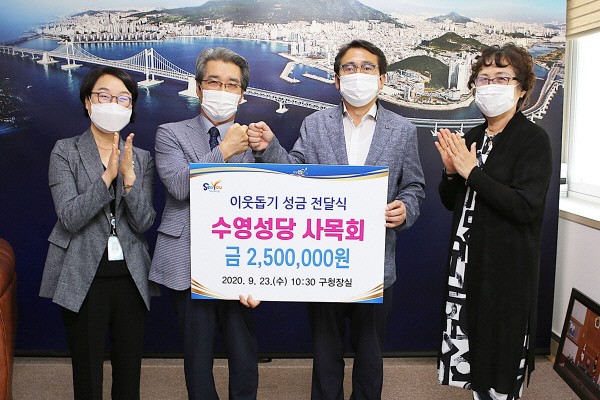 ¼ö¿µ±¸ ¼ö¿µ¼º´ç ÀÌ¿ôµ½±â ¼º±Ý ÈÄ¿ø¼ö¿µ±¸(±¸Ã»Àå °¼ºÅÂ)´Â 23ÀÏ ±¸Ã»Àå½Ç¿¡¼ °ü³» ¼ÒÀç ¼º´çÀÎ ¼ö¿µ¼º´ç »ç¸ñȸ(»ç¸ñȸÀå : ±¸º»Ã¶)·ÎºÎÅÍ »ýȰÀÌ ¾î·Æ°í °ü³» µµ¿òÀÌ ÇÊ¿äÇÑ Ãë¾à°èÃþ ¼¼´ë¸¦ ´ë»óÀ¸·Î Àü´ÞÇÒ ¼º±Ý 250¸¸ ¿øÀ» Àü´Þ¹Þ¾Ò´Ù.