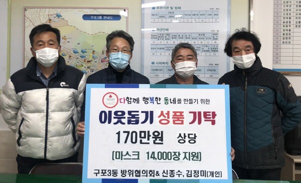 ºÏ±¸ ±¸Æ÷3µ¿ ¹æÀ§ÇùÀÇȸ, ÀÌ¿ôµ½±â ¼ºÇ° ±âŹºÎ»ê ºÏ±¸ ±¸Æ÷3µ¿ ÇàÁ¤º¹Áö¼¾ÅÍ(µ¿Àå ¼ÛÀμ±)´Â µ¿ ¹æÀ§ÇùÀÇȸ(ȸÀå Á¤¸í±Ô)¿Í µÎ ¸íÀÇ ÁÖ¹ÎÀÌ °ü³» Àú¼ÒµæÃþÀ» À§ÇØ 170¸¸¿ø »ó´çÀÇ ¸¶½ºÅ© 14000ÀåÀ» ±âŹÇß´Ù°í ¹àÇû´Ù. À̳¯ ±âºÎµÈ ¸¶½ºÅ©´Â ÇüÆíÀÌ ¾î·Á¿î ÀÌ¿ô 350¸í¿¡°Ô 40À徿 Áö¿øµÉ ¿¹Á¤ÀÌ´Ù.