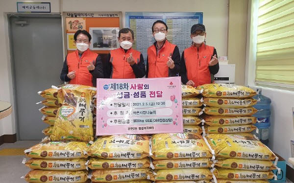 ¿ëÈ£2µ¿ Á÷¿ø ¹× 11°³ ´Üü¿øÀ¸·Î ±¸¼ºµÈ ¡®ÀÏõ¿ø »ç¶û³ª´©±â¡¯ ¿¡¼ ½Ò 10kg 18Æ÷, ÁÖ¹ÎÀÚÄ¡À§¿øÈ¸¿¡¼ ½Ò 10kg 15Æ÷, ´Ãºû±³È¸(Ȳ¼ºÇ¥ ¸ñ»ç)¿¡¼ 10kg 40Æ÷, ¿ëÈ£³²±³È¸(Àü¼º¼ö ¸ñ»ç)¿¡¼ 10kg 60Æ÷, Çö´ë½Ò»óȸ(´ëÇ¥ Á¤½ÖÁ¡)¿¡¼ 10kg 10Æ÷, ÈÞ¸¶Æ®(´ëÇ¥ À̱ÇÁÖ)¿¡¼ 10kg 25Æ÷¸¦ ÈÄ¿øÇÏ¿´´Ù.