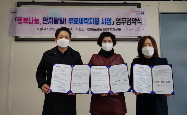 ¡®¼ö°ÅºÎÅÍ ¹è´Þ±îÁö¡¯ û·æ³ëÆ÷µ¿, ¹«·á¼¼Å¹ ¼ºñ½º °³½ÃºÎ»ê ±ÝÁ¤±¸(±¸Ã»Àå Á¤¹Ì¿µ) û·æ³ëÆ÷µ¿ Áö¿ª»çȸº¸ÀåÇùÀÇü(¹Î°£À§¿øÀå ÀÌÁ¾¼ö)´Â Áö³ 16ÀÏ ±ÝÁ¤±¸ Áö¿ªÀÚȰ¼¾ÅÍ(¼¾ÅÍÀå ½Å¿äÇÑ)¿Í ¡®Çູ³ª´®, ¸ÕÁöŻŻ! ¹«·á¼¼Å¹ Áö¿ø »ç¾÷¡¯ ¾÷¹«Çù¾àÀ» ü°áÇϰí Ãë¾à°èÃþÀ» À§ÇÑ ¹«·á¼¼Å¹ ¼ºñ½º »ç¾÷À» º»°ÝÈÇß´Ù.