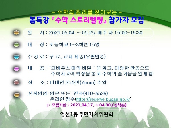 ¿µ¼±1µ¿, ºñ´ë¸é º½Æ¯°¡¸¼öÇÐ ½ºÅ丮ÅÚ¸µ¡¹¿î¿µ¿µ¼±1µ¿ ÁÖ¹ÎÀÚġȸ(À§¿øÀå ±èÁÂÇö)´Â ÃʵîÇб³ ÀúÇгâÀ» ´ë»óÀ¸·Î ±³°ú¿¬°è º½Æ¯° ´Ü±â°Á¡¸¼öÇÐ ½ºÅ丮ÅÚ¸µ¡¹À» 5¿ù ÇÑ ´Þ°£ ¿î¿µÇÒ ¿¹Á¤ÀÌ´Ù.