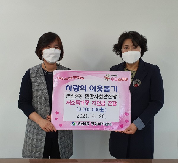 ¿¬»ê9µ¿, ¹Î°£»çȸ¾ÈÀü¸Á Àú¼Òµæ°¡Á¤ Áö¿ø±Ý Àü´Þ¿¬Á¦±¸ ¿¬»ê9µ¿(µ¿Àå ÀåÁø)Àº Áö³ 28ÀÏ ¹Î°£»çȸ¾ÈÀü¸Á(À§¿øÀå ÀÌ¿µ¼÷)À¸·ÎºÎÅÍ °¡Á¤ÀÇ ´ÞÀ» ¸Â¾Æ Àú¼Òµæ ÁֹΠÁö¿øÀ» À§ÇÑ ¼º±Ý 320¸¸ ¿øÀ» ±âŹ¹Þ¾Ò´Ù.
