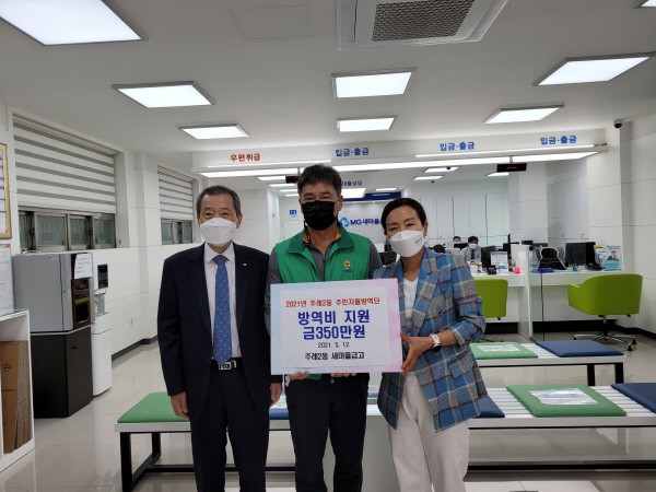 ÁÖ·Ê2µ¿ »õ¸¶À»±Ý°í, ÁÖ¹ÎÀÚÀ²¹æ¿ª´Ü ¹æ¿ªÈ°µ¿Áö¿ø±Ý 350¸¸ ¿ø Àü´Þ»ç»ó±¸ ÁÖ·Ê2µ¿ »õ¸¶À»±Ý°í(ÀÌ»çÀå ¹Úõ¼ö)´Â Áö³ 12ÀÏ Äڷγª19 È®»ê ¹æÁö ¹× ÇÏÀý±â Àü¿°º´ ¿¹¹æÀ» À§ÇØ Èû¾²°í ÀÖ´Â ÁÖ·Ê2µ¿ ÁÖ¹ÎÀÚÀ²¹æ¿ª´ÜÀÇ ³ë°í¸¦ °Ý·ÁÇÏ°í ¾ÕÀ¸·ÎÀÇ È°µ¿¿¡ Èû½á´Þ¶ó´Â Àǹ̷Π¹æ¿ªÈ°µ¿ Áö¿ø±Ý 350¸¸ ¿øÀ» Àü´ÞÇß´Ù.