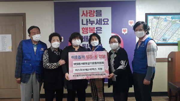 ºÎÀü2µ¿ ¹Ù¸£°Ô»ì±â¿îµ¿À§¿øÈ¸ ¹æ¿ª¸¶½ºÅ© ±âŹºÎ»êÁø±¸ ºÎÀü2µ¿ ¹Ù¸£°Ô»ì±â¿îµ¿À§¿øÈ¸(À§¿øÀå À̼øÀÓ)´Â ÃÖ±Ù ºÎÀü2µ¿Áֹμ¾ÅÍ¿¡ ¸¶½ºÅ© 2,000°³¿Í °£½Ä µîÀ» ±âŹÇß´Ù. À̳¯ ±âŹµÈ ¹°Ç°Àº °ü³» °æ·Î´ç¿¡ Àü´ÞµÉ ¿¹Á¤ÀÌ´Ù.