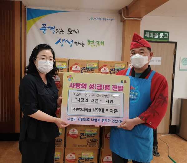 ¿¬»ê2µ¿ ÁÖ¹ÎÀÚÄ¡À§¿ø, ÀÌ¿ôµ½±â ¼ºÇ° ÈÄ¿ø ¿¬Á¦±¸ ¿¬»ê2µ¿(µ¿Àå ÁÖÀº¿µ)Àº 5¿ù 27ÀÏ ±è¿µÅÂ, ÃÖÀÚÁØ ÁÖ¹ÎÀÚÄ¡À§¿øÀ¸·ÎºÎÅÍ ¾î·Á¿î ÀÌ¿ôµ½±â ¼ºÇ°À¸·Î ¶ó¸é 40¹Ú½º(100¸¸ ¿ø »ó´ç)¸¦ ±âŹ¹Þ¾Ò´Ù.