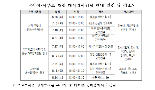ºÎ¿ï°æÁö¿ª ¡¸ÀǾà°è¿(ÀÇ¡¤Ä¡¡¤ÇÑ¡¤¾à¡¤¼ö) °øµ¿ ´ëÇÐÀÔÇÐÀüÇü ¾È³»¡¹µµ ÁøÇàÇÑ´Ù. °æ»ó±¹¸³´ë¡¤°æ¼º´ë¡¤°í½Å´ë¡¤µ¿¾Æ´ë¡¤µ¿ÀǴ롤ºÎ»ê´ë¡¤ÀÎÁ¦´ë µî 7°³ ´ëÇаú ºÎ»ê±¤¿ª½Ã ºÎ»êÀÎÀçÆò»ý±³À°ÁøÈï¿øÀÌ °øµ¿ ÁÖÃÖÇϸç, ÀÔÇÐÀüÇü ÁÖ¿ä»çÇ× ¹× ÀüÇü°á°ú µîÀ» Á¦°øÇÑ´Ù. 7¿ù 17ÀÏ ºÎ»ê, 8¿ù 7ÀÏ Ã¢¿ø¿¡¼ ÃÑ 2ȸ ¿¸± ¿¹Á¤ÀÌ´Ù.