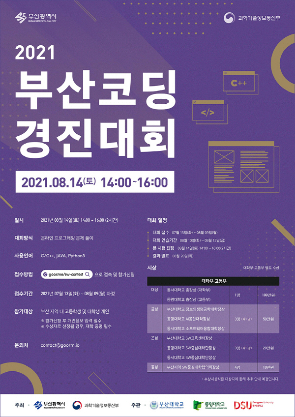 ¶Ç ºÎ»ê´ë ¼ÒÇÁÆ®¿þ¾î±³À°¼¾ÅÍ´Â ºÎ»êÁö¿ª SWÁ߽ɴëÇÐÇùÀÇȸ(ºÎ»ê´ë¡¤µ¿¸í´ë¡¤µ¿¼´ë)¿Í ÇÔ²² ¡®2021 ºÎ»êÄÚµù°æÁø´ëȸ¡¯¿Í ¡®Á¦6ȸ ºÎ»êICTÀ¶ÇÕ ÇØÄ«Åæ ´ëȸ¡¯¸¦ 8¿ù°ú 9¿ù¿¡ °¢°¢ °³ÃÖÇÑ´Ù.