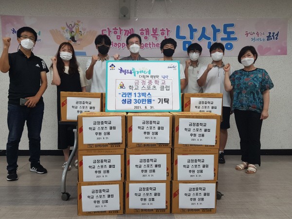 ±ÝÁ¤Áß ½ºÆ÷Ã÷Ŭ·´, ³²»êµ¿¿¡ ÀÌ¿ôµ½±â ¼ºÇ° ±âŹºÎ»ê ±ÝÁ¤±¸(±¸Ã»Àå Á¤¹Ì¿µ) ³²»êµ¿Àº ±ÝÁ¤ÁßÇб³ Çб³ ½ºÆ÷Ã÷Ŭ·´ÀÌ Áö³´Þ 31ÀÏ °ü³» ¾î·Á¿î ÀÌ¿ôÀ» µ½±â À§ÇØ ¶ó¸é 13»óÀÚ¿Í ¼º±Ý 30¸¸ ¿øÀ» ±âŹÇß´Ù°í ¹àÇû´Ù.