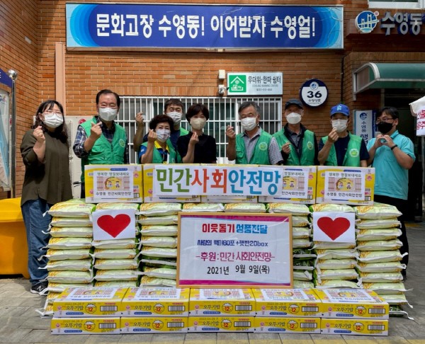 ºÎ»ê±¤¿ª½Ã ¼ö¿µ±¸ ¼ö¿µµ¿ÇàÁ¤º¹Áö¼¾ÅÍ(µ¿Àå Á¤Àº¼÷)´Â Áö³ 9ÀÏ ¼ö¿µµ¿ ¹Î°£»çȸ¾ÈÀü¸Á(À§¿øÀå ±èä¿ì)ÀÌ Ãß¼®À» ¸ÂÀÌÇÏ¿© ¾î·Á¿î ÀÌ¿ôÀ» À§ÇØ ¹é¹Ì 10kg 80Æ÷¿Í Áï¼®¹ä 20¹Ú½º(°¡¾× 310¸¸ ¿ø »ó´ç)¸¦ ÈÄ¿øÇÏ¿´´Ù°í ¹àÇû´Ù. ÈÄ¿ø¹ÞÀº ¹°Ç°´Â °ü³» ¿Ü·Ó°í ¾î·Á¿î ÀÌ¿ô 100¼¼´ë¿¡ ¼ÒÁßÈ÷ Àü´ÞÇÒ ¿¹Á¤ÀÌ´Ù.