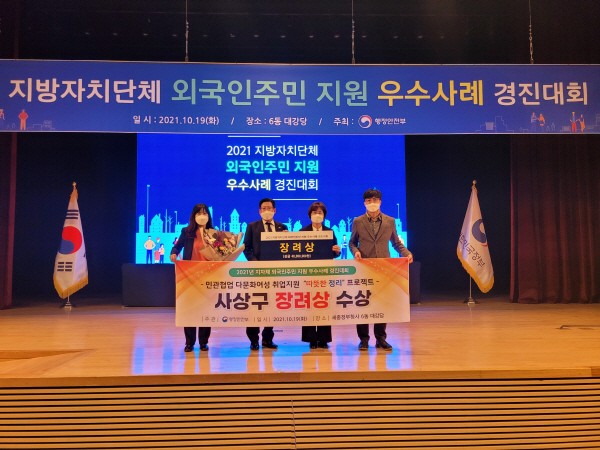 »ç»ó±¸, 2021³â ÁöÀÚü ¿Ü±¹ÀÎÁֹΠÁö¿ø Àå·Á»ó ¼ö»óºÎ»ê »ç»ó±¸´Â ÇàÁ¤¾ÈÁ¤ºÎ ÁÖ°ü 2021³â ÁöÀÚü ¿Ü±¹ÀÎÁֹΠÁö¿ø ¿ì¼ö»ç·Ê °æÁø´ëȸ¿¡¼ Àå·Á»óÀ» ¼ö»óÇß´Ù°í 19ÀÏ ¹àÇû´Ù.