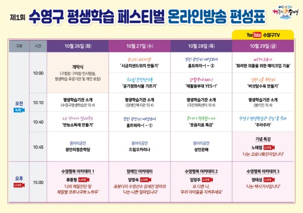 ¡®Æò»ýÇнÀ! ³ª¸¦ ã¾ÆÁà!¡¯ Á¦1ȸ ¼ö¿µ±¸ Æò»ýÇнÀ Æä½ºÆ¼¹ú °³Ãֺλ걤¿ª½Ã ¼ö¿µ±¸Ã»(±¸Ã»Àå °¼ºÅÂ)Àº ¿À´Â 10¿ù 26ÀϺÎÅÍ 29ÀϱîÁö ¡®Æò»ýÇнÀ! ³ª¸¦ ã¾ÆÁ࡯¶ó´Â ÁÖÁ¦·Î ¡®Á¦1ȸ ¼ö¿µ±¸ Æò»ýÇнÀÆä½ºÆ¼¹ú¡¯À» °³ÃÖÇÑ´Ù°í ¹àÇû´Ù.