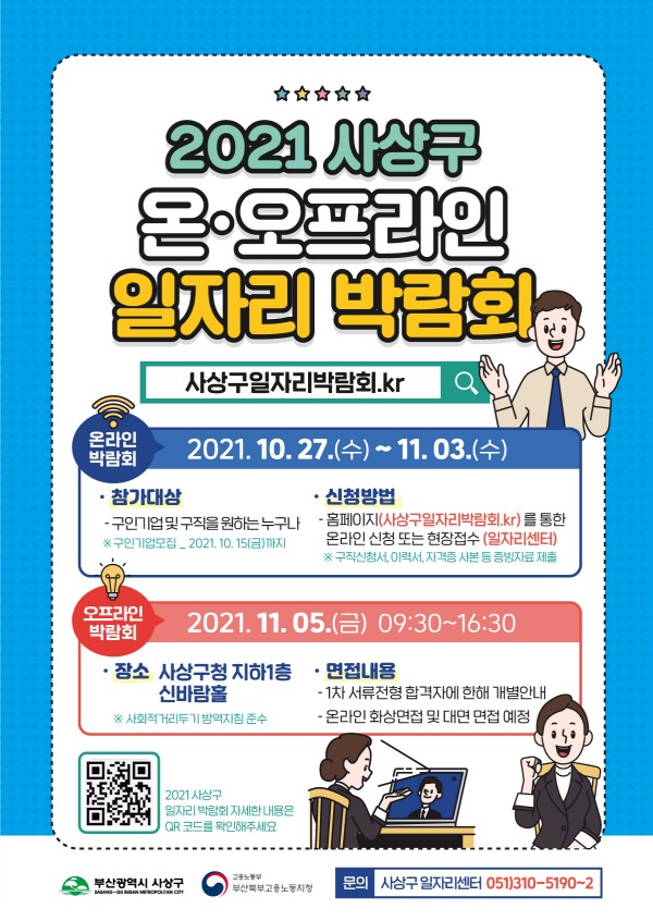 ¹Ú¶÷ȸ Âü¿©±â¾÷, ±â¾÷º° ¸ðÁýÁ÷Á¾, ±Ù¹«Á¶°Ç, ±¸Á÷½Åû¹æ¹ý µî ÀÚ¼¼ÇÑ »çÇ×Àº »ç»ó±¸ ÀÏÀÚ¸® ¹Ú¶÷ȸ ȨÆäÀÌÁö(https://»ç»ó±¸ÀÏÀÚ¸®¹Ú¶÷ȸ.kr, 10¿ù 27ÀÏ »çÀÌÆ® ¿ÀÇÂ) ¶Ç´Â ÀÏÀÚ¸®¼¾ÅÍ(¢Ï 310-5190~2)¸¦ ÅëÇØ È®ÀÎÇÒ ¼ö ÀÖ´Ù.