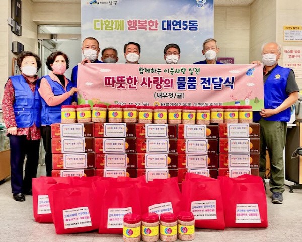 ´ë¿¬5µ¿ ¹Ù¸£°Ô»ì±âÀ§¿øÈ¸ ¡º»ç¶ûÀÇ ¼ºÇ° Àü´Þ¡» Çà»ç °³ÃÖºÎ»ê ³²±¸ ´ë¿¬5µ¿ ¹Ù¸£°Ô»ì±âÀ§¿øÈ¸(À§¿øÀå ±èÁ¾Å¹)´Â Áö³ 22ÀÏ ±èÀåöÀ» ¸Â¾Æ °ü³» Ȧ·Î ¾î¸£½Å 30¸í¿¡°Ô µû¶æÇÑ »ç¶ûÀÇ ¼ºÇ°À» Àü´ÞÇß´Ù.