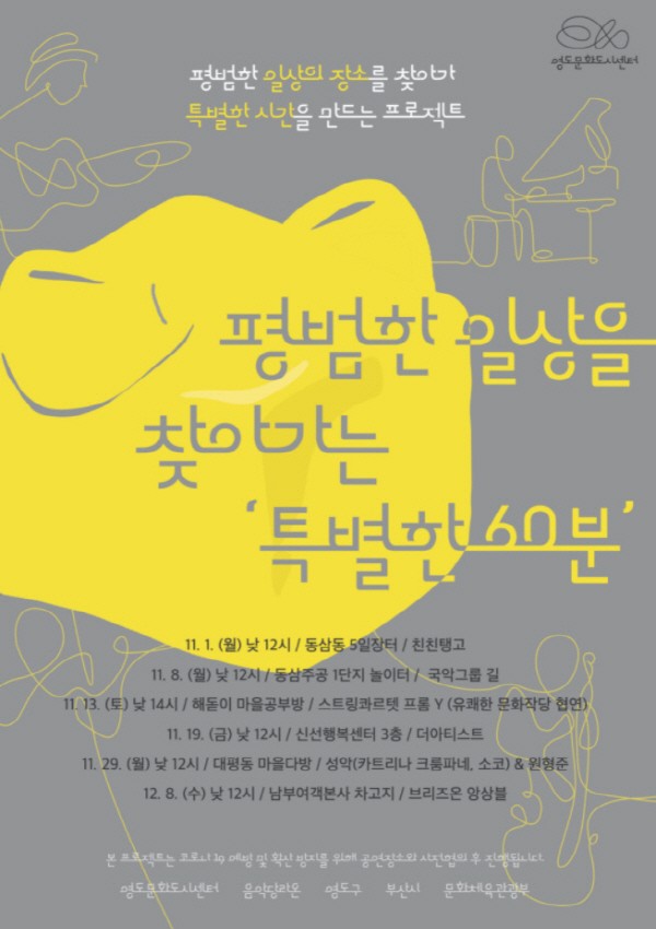 ¿µµµ¹®Èµµ½Ã¼¾ÅÍ, Æò¹üÇÑ ÀÏ»óÀ» ã¾Æ°¡´Â ¡¸Æ¯º°ÇÑ 60ºÐ¡¹ °³ÃÖ¿µµµ¹®Èµµ½Ã¼¾ÅÍ(¼¾ÅÍÀå °íÀ±Á¤)´Â ¿À´Â 11¿ù 1ÀÏ(¿ù) ù ȸ °ø¿¬À» ½ÃÀÛÀ¸·Î ÃÑ ¿©¼¸ Â÷·Ê ã¾Æ°¡´Â ¹®È°ø¿¬À» ÅëÇØ »õº®½ÃÀå »óÀÎ, ¸¶À»°øºÎ¹æ ¾ÆÀ̵é, ´ëÁß±³Åë¿î¼ö¾÷ Á¾»çÀÚ µî Æò¹üÇÑ ÀÏ»óÀÇ Áֹΰú ¸¸³ª´Â <Ưº°ÇÑ 60ºÐ> ÇÁ·ÎÁ§Æ®¸¦ ÃßÁøÇÑ´Ù.