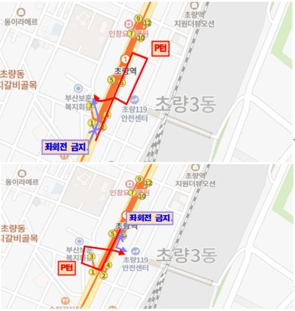 ºÎ»ê½Ã´Â µ¿±¸ ÃÊ·®±³Â÷·Î Àαٿ¡ BRT Áß¾Ó ¹ö½ºÁ¤·ùÀåÀÌ µé¾î¼¸é¼ ¿À´Â 4ÀϺÎÅÍ ºÎµÎ ¹× ¼öÁ¤µ¿ ¹æÇâÀ¸·Î ÁÂȸÀüÀÌ ±ÝÁöµÈ´Ù°í 1ÀÏ ¹àÇû´Ù. ÀÌ¿¡ µû¶ó ¼¸é¿¡¼ ºÎ»ê¿ª ¹æÇâÀ¸·Î À̵¿ÇÏ´Â Â÷·®Àº Á¤¹ßÀ屺 µ¿»ó ¾Õ¿¡¼ ºÎµÎ ¹æÇâÀ¸·Î ÁÂȸÀüÇÏÁö ¸øÇϰí 100£í°¡·® ´õ ÁøÇàÇÑ µÚ ¿ìÃøÀ¸·Î PÅÏÀ» ¹Þ¾Æ¾ß ÇÑ´Ù. ºÎ»ê¿ª¿¡¼ ¼¸éÀ¸·Î ÇâÇÏ´Â Â÷·®µµ ÃÊ·®±³Â÷·Î¿¡¼ ÁÂȸÀüÇØ ¼öÁ¤µ¿À¸·Î ÁøÀÔÇßÁö¸¸ 4ÀϺÎÅÍ´Â Àü¹æÀ¸·Î 200£í ´õ °£ µÚ ¿ìÃøÀ¸·Î PÅÏÀ» ÇØ¾ß ¼öÁ¤µ¿À¸·Î ÁøÀÔÇÒ ¼ö ÀÖ´Ù.