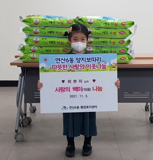 ¿¬»ê6µ¿ ÃÖÇöÁö ¾î¸°ÀÌ, »ç¶ûÀÇ ¹é¹Ì ³ª´®¿¬Á¦±¸ ¿¬»ê6µ¿(µ¿Àå ÃÖÇö¿í)Àº Áö³ 5ÀÏ Áö¿ªÁֹΠÃÖÇöÁö ¾î¸°ÀÌ(6¼¼)·Î ºÎÅÍ ¹é¹Ì(10§¸) 10Æ÷¸¦ ±âŹ¹Þ¾Æ Àú¼Òµæ Áֹο¡°Ô Áö¿øÇÒ ¿¹Á¤ÀÌ´Ù.