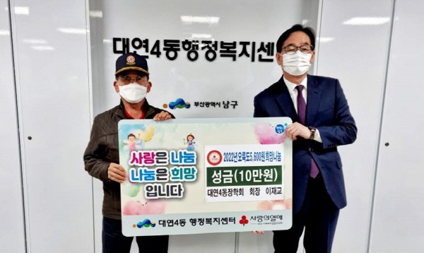 ´ë¿¬4µ¿ ÀåÇÐȸ ȸÀå ÀÌÀç±³ ¡¸¿À·úµµ 5600¿ø Èñ¸Á³ª´®¡¹ ¼º±Ý±âŹºÎ»ê ³²±¸ ´ë¿¬4µ¿ ÀåÇÐȸ ȸÀå(ÀÌÀç±³)Àº Áö³ 12ÀÏ ´ë¿¬4µ¿ ÇàÁ¤º¹Áö¼¾Å͸¦ ¹æ¹®ÇÏ¿© ¼º±Ý 10¸¸ ¿øÀ» ±âŹÇß´Ù.