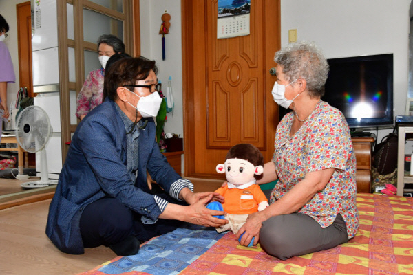 | ±èÀ챂 ¾ç»ê½ÃÀåÀÌ Áö¿ªÀÇ ÇÑ Àå¾Ö ¾î¸£½Å¿¡°Ô ½º¸¶Æ® µ¹º½ ÀÎÇüÀ» Àü´ÞÇÏ¸ç °Ý·ÁÇϰí ÀÖ´Ù.
