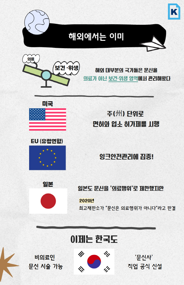 ÇÁ¶û½º¡¤Å±¹ µîÀº °øÁߺ¸°Ç Â÷¿ø¿¡¼ ½Ã¼úÀÚ °Ç°°ËÁø°ú À§»ý ±³À°À» Àǹ«ÈÇÑ´Ù. ÇÁ¶û½º¿¡¼ ¹®½Å ½Ã¼úÀ» ÇÏ·Á¸é À§»ý ±³À°(3ÀÏ ¿¬¼Ó, ÃÖ¼Ò 21½Ã°£)À» ¹ÞÀº ÈÄ Áö¹æ º¸°Çû¿¡ ½Å°íÇØ¾ß ÇÑ´Ù. ű¹Àº ¹®½Å ¼ºñ½º Á¾»çÀÚ¿¡°Ô °³ÀÎ °Ç°Àº ¹°·Ð Æó±â¹° °ü¸® ´É·Â±îÁö ¿ä±¸ÇÑ´Ù. Á¾»çÀڴ ȣÈí±â³ª ÇǺΠÁúȯÀÌ ¾ø¾î¾ß ÇÑ´Ù. ¸Å³â ½Åü°Ë»ç¸¦ ¹Þ¾Æ BÇü¡¤CÇü °£¿°, °áÇÙ µî °¨¿°¼º ÁúȯÀÌ ¾ø´Ù´Â »ç½Çµµ Áõ¸íÇØ¾ß ÇÑ´Ù. ÀϺ»Àº °ú°Å Çѱ¹Ã³·³ ¹®½ÅÀ» ÀÇ·á ÇàÀ§·Î Á¦ÇÑÇß´Ù. ±×·¯³ª 2020³â ÃÖ°íÀçÆÇ¼Ò°¡ ¡°¹®½ÅÀº ÀÇ·áÇàÀ§°¡ ¾Æ´Ï´Ù¡±°í ÆÇ°áÇÏ¸é¼ »óȲÀÌ ¹Ù²î¾ú´Ù. ¹ý¿øÀº ¹®½ÅÀ» ¿¹¼úÀû Ç¥ÇöÀ¸·Î º¸°í, ÀÇ·á°¡ ÀüÅëÀûÀ¸·Î ´ã´çÇØ¿Â ¿µ¿ªÀÌ ¾Æ´Ï¶ó°í ÆÇ´ÜÇß´Ù. ÀÌ¿¡ µû¶ó 2022³âºÎÅÍ ÀϺ» Á¤ºÎ´Â À§»ý°ú ¾ÈÀü ±ÔÁ¤À» »õ·Î ¸¶·ÃÇØ Á¦µµ¸¦ Á¤ºñÇß´Ù.