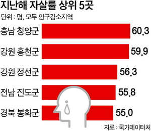 ½ÉÁö¾î Á¤½Å°ú Àǻ簡 ÇÑ ¸íµµ ¾ø¾ú´ø Àü±¹ ½Ã¡¤±º¡¤±¸ 28°÷ Áß 85.7%(24°÷)°¡ Àα¸°¨¼Ò Áö¿ªÀ̾ú´Ù. ÀÚ»ì·ü »óÀ§ Áö¿ªÀÎ Ãæ³² û¾ç±º, °¿ø Á¤¼±±º, °æºÏ ºÀȱº µîµµ ÀÌ¿¡ Æ÷ÇԵƴÙ.