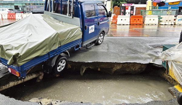 Áö³ 8¿ù 12ÀÏ ¿ÀÀü ºÎ»ê »ç»ó±¸ °¨Àüµ¿ »õº®½ÃÀå Á¤¹® ¾Õ µµ·Î¿¡¼ ¹ß»ýÇÑ ½ÌũȦ(¶¥ ²¨Áü)¿¡ Æ®·° µÞ¹ÙÄû°¡ ºüÁ® ÀÖ´Ù. ±¹Á¦½Å¹®DB
