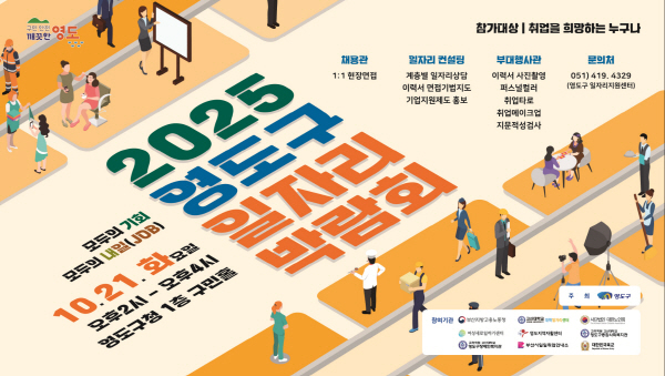 ºÎ»ê ¿µµµ±¸(±¸Ã»Àå ±è±âÀç)´Â ±¸Á÷ÀÚ¿Í ±â¾÷ °£ ¸¸³²ÀÇ ÀåÀ» ¸¶·ÃÇÏ°í ´Ù¾çÇÑ Ãë¾÷ ±âȸ¸¦ Á¦°øÇϱâ À§ÇØ ¿À´Â 10¿ù 21ÀÏ(È) ¿ÀÈÄ 2½ÃºÎÅÍ 4½Ã±îÁö ¿µµµ±¸Ã» 1Ãþ ±¸¹ÎȦ¿¡¼ ¡®2025³â ¿µµµ±¸ ÀÏÀÚ¸®¹Ú¶÷ȸ¡¯¸¦ °³ÃÖÇÑ´Ù°í ¹àÇû´Ù.