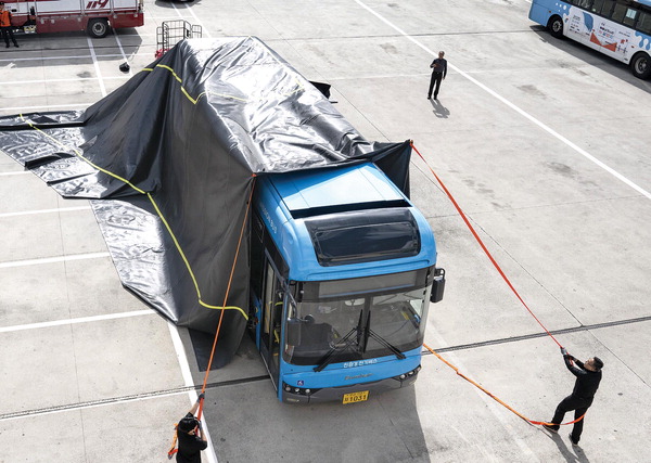 15ÀÏ ºÎ»ê ¿¬Á¦±¸ ¿¬Á¦°ø¿ëÂ÷°íÁö¿¡¼ Àü±â¹ö½º ÈÀç Ãʵ¿Á¶Ä¡ ½Ã½ºÅÛ ½Ã¿¬È¸°¡ ¿·È´Ù. ÈÀç »óȲÀ» °¡Á¤Çϰí Á¤Â÷µÈ Àü±â¹ö½º ÇÑ ´ë¿¡¼ °æ°íÀ½ÀÌ ¿ä¶õÇÏ°Ô ¿ï¸®´õ´Ï, ¹ö½º ³»ºÎ¿¡¼ ¡®ÈÀç°¡ ¹ß»ýÇß´Ù¡¯´Â À½¼ºÀÌ Èê·¯³ª¿Ô´Ù. ±×¿Í µ¿½Ã¿¡ ÁغñµÈ °ËÀº»öÀÇ Ä¿´Ù¶õ µ¤°³°¡ ¹ö½º Àüü¸¦ ¿ÏÀüÈ÷ °¨½Î¸é¼ »óȲÀº ¼ø½Ä°£¿¡ Á¾·áµÆ´Ù. ¸ðµç °úÁ¤Àº 10ºÐÀÌ Ã¤ °É¸®Áö ¾Ê¾Ò´Ù.