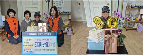 ³²ºÎ¹Î2µ¿ Áö¿ª»çȸº¸ÀåÇùÀÇü(À§¿øÀå ¹èÂù½Ä)´Â Áö³ 10¿ù 31ÀÏ °Ç°°ú ÇູÀ» ¡¸¿Â±â°¡µæ »ê¼ö¿¬(ß¡áøæÃ)¡¹ »ç¾÷À» ÃßÁøÇÏ¿´´Ù. º» »ç¾÷Àº Áö¿ª»çȸº¸ÀåÇùÀÇü À§¿øµéÀÌ Ãë¾à°èÃþ Ȧ·Î ¾î¸£½ÅÀÇ °Ç°°ú Àå¼ö¸¦ ±â¿øÇÏ¸ç ÆÈ¼ø »ý½ÅÀ» ÇÔ²² ÃàÇÏÇÏ´Â ÀÚ¸®·Î, ¹Î°üÇù·Â ³ª´®¾÷ü ³²ºÎ¹Î¶±¹æ¾Ñ°£(´ëÇ¥ ¹Ú°æÈ¯), µ¿ÀϾ౹(´ëÇ¥ ¿À¾ç¼÷), À¯¸®²ÉÈ¿ø(´ëÇ¥ Àü¼øµæ), ±î²¿»Ç²¿Çì¾î(´ëÇ¥ À¯Ã»ÀÚ)¿¡¼ ¶±ÄÉÀÌÅ©, °Ç°½Äǰ, ¹Ý·Á½Ä¹°, Çì¾î¼ºñ½º¸¦ Áö¿øÇÏ¿´´Ù.