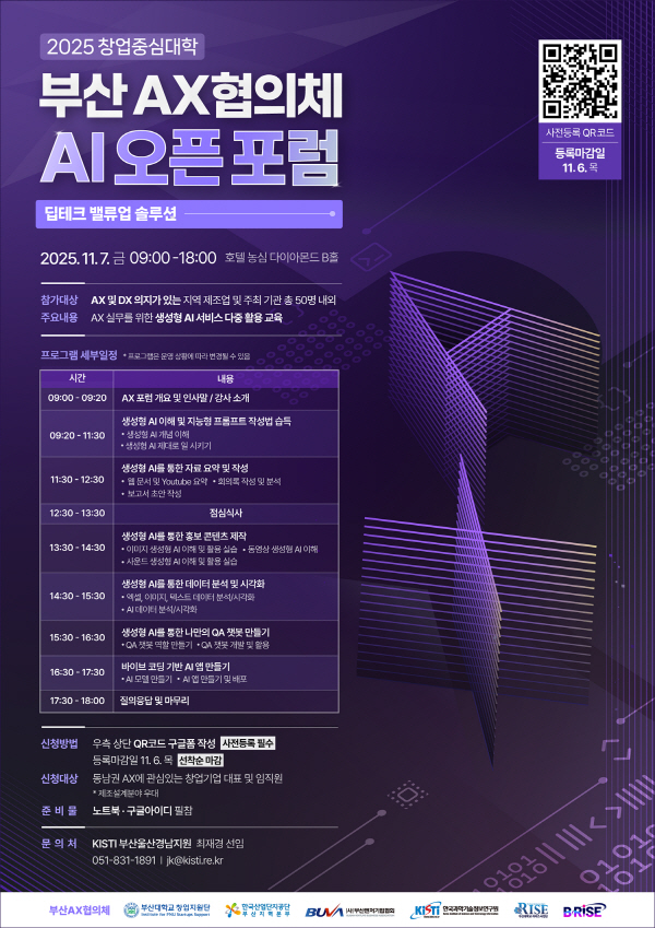 ¡®ºÎ»êAXÇùÀÇü AI¿ÀÇÂÆ÷·³¡¯Àº ±Þº¯ÇÏ´Â »ê¾÷ ȯ°æ ¼Ó¿¡¼ Áö¿ª â¾÷±â¾÷ÀÇ ±â¼ú»ç¾÷È¿Í »ê¾÷ °£ À¶ÇÕ¡¤Çõ½Å â¾÷À» Áö¿øÇϰíÀÚ °³Ãֵǰí ÀÖ´Ù. ƯÈ÷, À̹ø Çà»ç´Â Áö¿ª ±â¼úÁß½É Ã¢¾÷ ±â¾÷ ¹ß±¼°ú ½ºÄÉÀϾ÷À» ¸ñÇ¥·Î ¡®AX ½Ç¹«¸¦ À§ÇÑ »ý¼ºÇü AI ¼ºñ½º ´ÙÁß È°¿ë ±³À°¡¯À» ¿î¿µÇÑ´Ù.