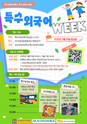 ºÎ»ê¿Ü±¹¾î´ëÇб³(ÃÑÀå Àå¼øÈï) Ư¼ö¿Ü±¹¾î»ç¾÷´ÜÀº ¿À´Â 29ÀÏ KF¾Æ¼¼¾È¹®È¿ø¿¡¼ Áö¿ª¹Î°ú ÇÔ²²ÇÏ´Â ¡®Æ¯¼ö¿Ü±¹¾î WEEK¡¯¸¦ °³ÃÖÇÑ´Ù°í 7ÀÏ ¹àÇû´Ù.