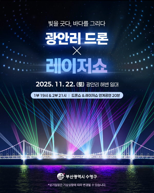 ºÎ»ê±¤¿ª½Ã ¼ö¿µ±¸(±¸Ã»Àå °¼ºÅÂ)´Â ¿À´Â 11¿ù 22ÀÏ(Åä) Àú³á 7½Ã¿Í 9½Ã ÃÑ 2ȸ¿¡ °ÉÃļ ±¤¾È¸® ÇØº¯À» ¹«´ë·Î µå·ÐÀÇ ¿ªµ¿ÀûÀÎ ºñÇà°ú È·ÁÇÑ ·¹ÀÌÀú ¿¬Ãâ·Î ±¤¾È´ë±³ Àϴ븦 ºûÀ¸·Î ¼ö³õÀ»¡º±¤¾È¸® ·¹ÀÌÀú¼î¡» Ưº°°ø¿¬À» °³ÃÖÇÑ´Ù°í ¹àÇû´Ù.