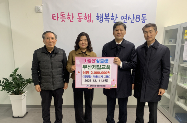 ¿¬Á¦±¸ ¿¬»ê8µ¿(µ¿Àå À¯¼öÇö)Àº 12¿ù 11ÀÏ ºÎ»êÁ¦Àϱ³È¸(´ãÀÓ¸ñ»ç ¼Õ¿µ±Ô)·ÎºÎÅÍ ¾î·Á¿î ÁÖ¹ÎÀÇ µû¶æÇÑ °Ü¿ï³ª±â Áö¿øÀ» À§ÇÑ ¼º±Ý 200¸¸¿øÀ» ÈÄ¿ø¹Þ¾Ò´Ù.