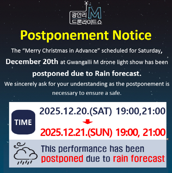 ºÎ»ê±¤¿ª½Ã ¼ö¿µ±¸(±¸Ã»Àå °¼ºÅÂ)´Â ¸ÅÁÖ Åä¿äÀÏ ±¤¾È¸® ÇØº¯¿¡¼ °³ÃֵǴ ¡¸±¤¾È¸® M µå·Ð¶óÀÌÆ®¼î¡¹ÀÇ 12¿ù 20ÀÏ(Åä) °ø¿¬À» ¿ìõ ¿¹º¸¿¡ µû¶ó, À̹ø Å©¸®½º¸¶½º ½ÃÁð Æ¯º°°ø¿¬¿¡ ÇÑÇØ °ø¿¬ ÀÏÁ¤À» 12¿ù 21ÀÏ(ÀÏ)·Î º¯°æÇØ ÁøÇàÇÑ´Ù°í ¹àÇû´Ù.