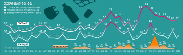 ÀÌó·³ À¯±â¹°°ú ¼¼±Õ ¿À¿°ÀÌ ½É°¢ÇÏÁö¸¸, Ãë¼ö Áß´Ü µî °µµ ³ôÀº Á¶Ä¡°¡ ÀÌ·ïÁöÁö ¾ÊÀº ÀÌÀ¯´Â ´Ù¸¥ ÁöÇ¥µé°úÀÇ ¡®Æò±ÕÄ¡¡¯ ¶§¹®ÀÌ´Ù. °°Àº ±â°£ »ý¹°ÈÇÐÀû»ê¼Ò¿ä±¸·®(BOD)°ú ºÎÀ¯¹°Áú(SS), ¿ëÁ¸»ê¼Ò(DO)´Â ´ëºÎºÐ 1¡¤2µî±ÞÀÇ ¾çÈ£ÇÑ ¼öÄ¡¸¦ ±â·ÏÇß´Ù. ºÎ»ê »ó¼öµµ»ç¾÷º»ºÎ´Â »ó¼ö¿ø°ü¸®±ÔÄ¢¿¡ µû¶ó ÃøÁ¤ÇÑ °ªÀ» Æò±Õ³½ ¿¬°£ ¼öÄ¡¸¦ ±âÁØÀ¸·Î ¼öÁúÀ» Æò°¡Çϱ⠶§¹®ÀÌ´Ù. ¿©¸§Ã¶¿¡ ±â·ÏÇÑ 3¡¤4µî±Þ ¼öÄ¡´Â ºñ±³Àû ¼öÄ¡°¡ ¾çÈ£ÇÏ°Ô ³ª¿À´Â º½¡¤°¡À»¡¤°Ü¿ï ¼öÄ¡¿¡ Èñ¼®µÈ´Ù.
