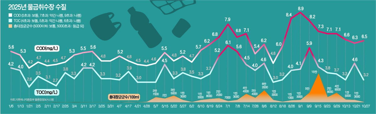 4ÀÏ ¹°È¯°æÁ¤º¸½Ã½ºÅÛÀ» º¸¸é ¹°±Ý¡¤¸Å¸® Ãë¼öÀå Àαٿ¡¼ ÇØ´ç ±â°£ TOC, COD, ´ëÀå±Õ±º µî Ç׸ñ¿¡¼ 3(º¸Åë)~5(³ª»Ý) µî±ÞÀÇ ¼öÁúÀÌ ÃøÁ¤µÆ´Ù. ¹°±Ý¡¤¸Å¸® Ãë¼öÀåÀº ³«µ¿° ¹°À» ²ø¾îµé¿© ºÎ»ê°ú °æ³² ±èÇØ¡¤¾ç»ê ÁֹεéÀÌ ½Ä¼ö ¼öµ¾¹° µîÀ¸·Î »ç¿ëÇÒ ¼ö ÀÖµµ·Ï Á¤¼öÀåÀ¸·Î º¸³»´Â °÷ÀÌ´Ù.