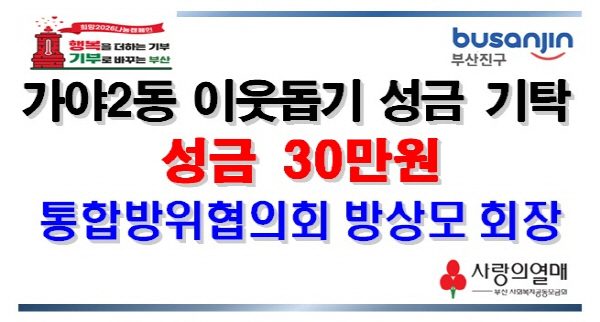 ºÎ»êÁø±¸ °¡¾ß2µ¿ ÅëÇÕ¹æÀ§ÇùÀÇȸ ȸÀå ¹æ»ó¸ð´Â ¾î·Á¿î ÀÌ¿ôÀ» µ½±â À§ÇÑ ¼º±Ý 30¸¸¿øÀ» °¡¾ß2µ¿ Áֹμ¾ÅÍ(µ¿Àå ±è¿µ¹Ì)¿¡ ±âŹÇß´Ù.