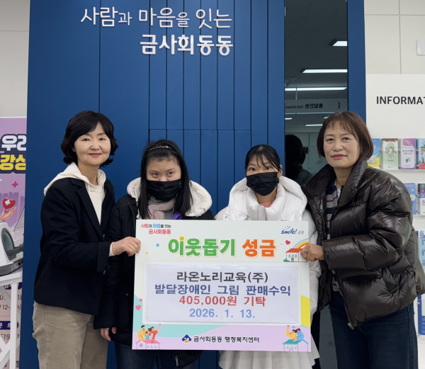 ºÎ»ê ±ÝÁ¤±¸ ±Ý»çȸµ¿µ¿ ¼ÒÀç ¶ó¿Â³ë¸®±³À°(ÁÖ)(´ëÇ¥ Á¤¿ÁÁø)Àº Áö¿ª ³» ¾î·Á¿î ÀÌ¿ôÀ» À§ÇØ ¹ß´ÞÀå¾ÖÀÎ ±×¸² ÆÇ¸Å ¼öÀÍ±Ý 405,000¿ø Àü¾×À» ±Ý»çȸµ¿µ¿ ÇàÁ¤º¹Áö¼¾ÅÍ¿¡ ±âºÎÇß´Ù.