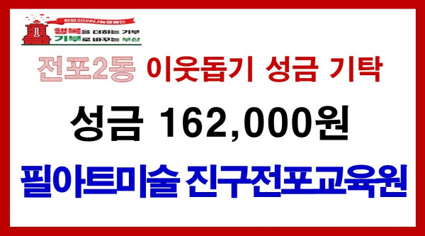 ºÎ»êÁø±¸ ÇÊ¾ÆÆ® ¹Ì¼ú Áø±¸ ÀüÆ÷ ±³À°¿ø(´ëÇ¥ Á¤°©Èñ)Àº 1¿ù 14ÀÏ ÀüÆ÷2µ¿ Áֹμ¾ÅÍ(µ¿Àå ½Å¹Ì¼±)¸¦ ¹æ¹®ÇÏ¿© ÆË¾÷½ºÅä¾î ¿î¿µ ¼öÀÍ±Ý 162õ¿øÀ» ±âŹÇß´Ù.