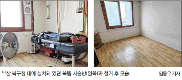 1. ¿ÀÅ¿ø ºÎ»ê ºÏ±¸Ã»ÀåÀÌ ¾à 6~7°³¿ù ÀüºÎÅÍ ºÏ±¸Ã»»ç ³» ºñ¾îÀÖ´ø »ç¹«½Ç °ø°£À» Ȱ¿ëÇØ ¾¦¶ä ½Ã¼³À» ¼³Ä¡Çϰí ÀÌ¿ëÇØ ¿Â »ç½ÇÀÌ ¾Ë·ÁÁø ÈÄ, ÇØ´ç °ø°£¿¡ ¼³Ä¡µÆ´ø ħ´ë¡¤Á¿å±â¡¤È¯±â½Ã¼³ µîÀÌ ¸ðµÎ ö°ÅµÆ½À´Ï´Ù. ÀÌ ½Ã¼³Àº ¿À ±¸Ã»ÀåÀÌ ÀÚ½ÅÀÇ °Ç° °ü¸®¸¦ À§ÇØ »ç¿ëÇØ¿Ô´Ù°í ¾Ë·ÁÁ³½À´Ï´Ù.
