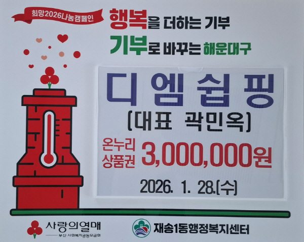 (ÁÖ)µð¿¥½±ÇÎ(´ëÇ¥ °û¹Î¿Á)Àº Áö³ 28ÀÏ, Àç¼Û1µ¿ ÇàÁ¤º¹Áö¼¾ÅÍ(µ¿Àå ±è¿ë¹«)¿¡ ¿Â´©¸®»óǰ±Ç 300¸¸ ¿ø »ó´çÀ» ±âºÎÇß´Ù.