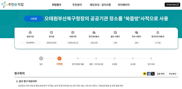Çà¾ÈºÎ°¡ ¿î¿µÇÏ´Â ÁÖ¹ÎeÁ÷Á¢ ȨÆäÀÌÁö¿¡¼­ º»ÀÎ ÀÎÁõÀ» °ÅÄ£ µÚ ÀüÀÚ ¼­¸íÀÌ ÀÌ·ïÁ® ÀÌÈÄ ÇàÁ¤ ÀýÂ÷´Â ºü¸£°Ô ÁøÇàµÉ Àü¸ÁÀÌ´Ù. ºÏ±¸´Â ÁֹΠ°¨»ç û±¸°¡ û±¸µÇÀÚ Áö³­ 8Àϲ² Âø¼öÇÑ ÀÚü °¨»ç´Â ÁøÇàÇÏÁö ¾Ê±â·Î °áÁ¤Çß´Ù. ±¸ °ü°èÀÚ´Â ¡°Ã»±¸°¡ ÀοëµÇ¸é »ó±Þ ±â°üÀÎ ºÎ»ê½Ã°¡ °¨»çÇÑ´Ù¡±°í ¸»Çß´Ù. ºÏ±¸´Â °¨»ç °á°ú¸¦ Å뺸¹ÞÀ¸¸é ±×¿¡ µû¸¥ Á¶Ä¡¸¦ ÇÒ °èȹÀÌ´Ù.