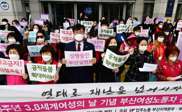 | ¼¼°è¿©¼ºÀdz¯À» ¸Â¾Æ ¸ñ¼Ò¸®¸¦ ³»°í ÀÖ´Â ¿©¼º³ëµ¿ÀÚµé. ±¹Á¦½Å¹®DB |