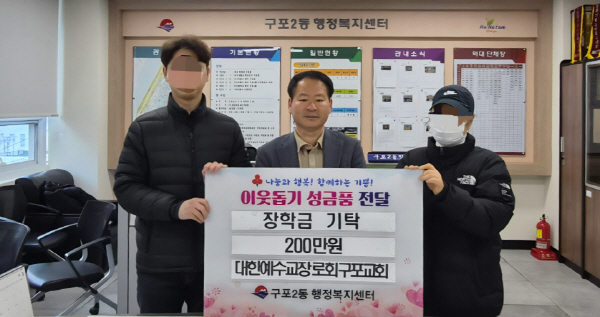 ºÎ»ê ºÏ±¸ ±¸Æ÷2µ¿ ÇàÁ¤º¹Áö¼¾ÅÍ(µ¿Àå °¸í¼®)´Â Áö³ 3ÀÏ ±¸Æ÷±³È¸(´ãÀÓ¸ñ»ç ±èÁ¾ÀÎ)·ÎºÎÅÍ ±âʹÞÀº ÀåÇÐ±Ý 200¸¸ ¿øÀ» °ü³» °íµîÇб³ 3Çгâ Çлý 2¸í¿¡°Ô 1Àδç 100¸¸ ¿ø¾¿ Àü´ÞÇß´Ù°í ¹àÇû´Ù.