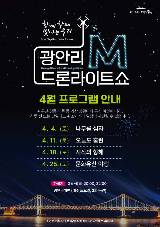 ºÎ»ê±¤¿ª½Ã ¼ö¿µ±¸(±¸Ã»Àå °¼ºÅÂ)´Â ¸ÅÁÖ Åä¿äÀÏ Àú³á 1,000´ë ±Ô¸ðÀÇ ¡¸±¤¾È¸® M µå·Ð¶óÀÌÆ®¼î¡¹¸¦ »ó¼³·Î °³ÃÖÇϰí ÀÖÀ¸¸ç 4¿ù¿¡µµ ±â³äÀϰú °èÀý¼º¿¡ ¸ÂÃá ÁÖÁ¦¿Í âÀÇÀûÀÎ Å׸¶·Î ´Ù¾çÇÑ °ø¿¬ÀÌ ÆîÃÄÁú ¿¹Á¤À̶ó°í ¹àÇû´Ù.