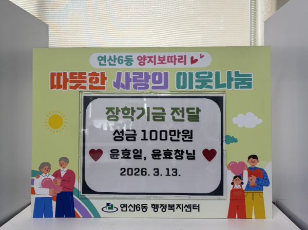 ¿¬Á¦±¸ ¿¬»ê6µ¿(µ¿Àå ÀÌÁ¤¾Æ)Àº 3¿ù 13ÀÏ °ú°Å ¿¬»ê6µ¿¿¡ °ÅÁÖÇß´ø À±È¿ÀÏ¡¤À±È¿Ã¢ ¾¾·ÎºÎÅÍ ¿¬À°Çü¼³ÀåÇÐȸ(ȸÀå Á¶´ëÇö) ÀåÇбâ±Ý 100¸¸¿øÀ» ±âºÎ¹Þ¾Ò´Ù.