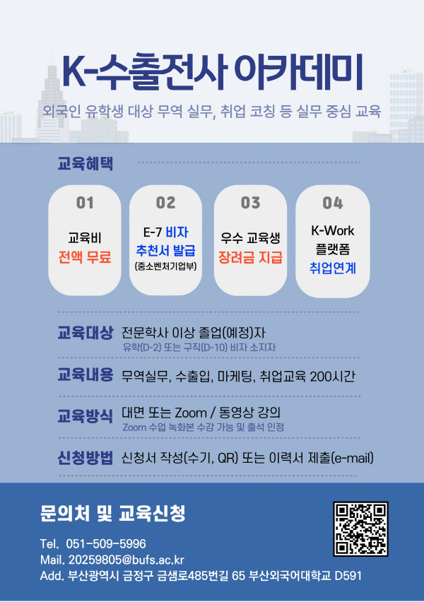 ¡®K-¼öÃâÀü»ç ¾ÆÄ«µ¥¹Ì¡¯´Â ¿Ü±¹ÀÎ À¯ÇлýÀÇ ±¹³» Ãë¾÷°ú Áß¼Ò±â¾÷ÀÇ Àη³ ÇØ¼Ò¸¦ ¿¬°èÇÏ´Â Á¤ºÎ Áö¿ø »ç¾÷À¸·Î ºÎ»ê¿Ü´ë´Â Áö³ÇØ ¸ðÁý ¸ñÇ¥ ´ëºñ 159% ´Þ¼º, ±³À°»ý ¸¸Á·µµ 9.54Á¡, 393°³ ±â¾÷ ³×Æ®¿öÅ© ±¸Ãà µî ¿ì¼öÇÑ ¼º°ú¸¦ °ÅµÎ¸ç Áß¼Òº¥Ã³±â¾÷ºÎ Àå°ü»óÀ» ¼ö»óÇÑ ¹Ù ÀÖ´Ù.