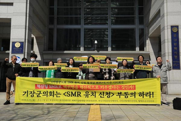 | Å»Çٺλê½Ã¹Î¿¬´ë µî ȯ°æ´ÜüµéÀº 23ÀÏ ¿ÀÀü 11½Ã ºÎ»ê½Ãû ±¤Àå¿¡¼ ±âÀ屺ÀÇȸ¿¡ 'SMR À¯Ä¡ ½Åû' µ¿ÀǾȿ¡ ºÎµ¿ÀÇÇ϶ó°í Ã˱¸Çß´Ù. Å»Çٺλê½Ã¹Î¿¬´ë Á¦°ø |